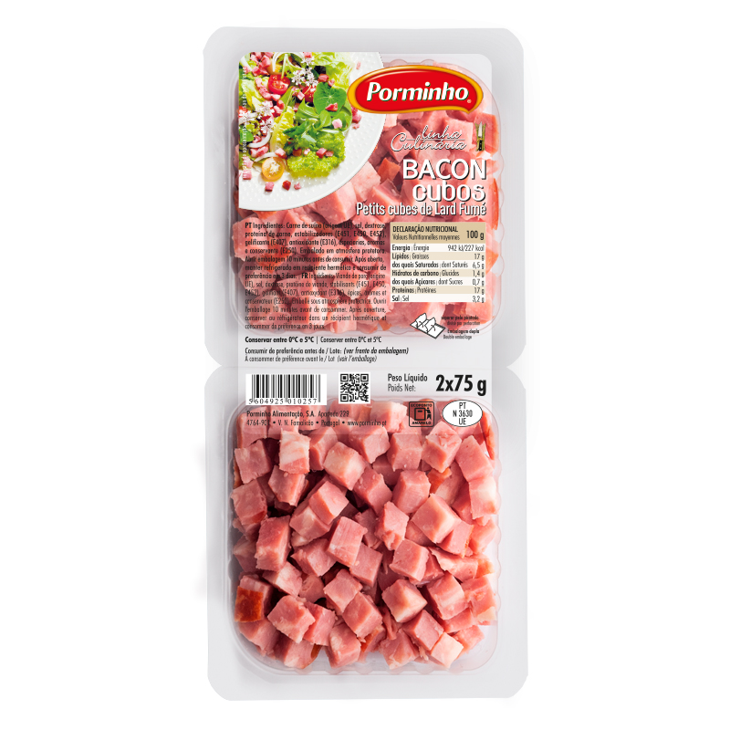 INGREDIENTES: Entremeada e carne de suíno (origem: UE), sal, dextrose, proteína de carne, estabilizadores (E451, E450, E452), gelificantes (E407, E410, E508), antioxidante (E316), especiarias, aromas e conservante (E250).
