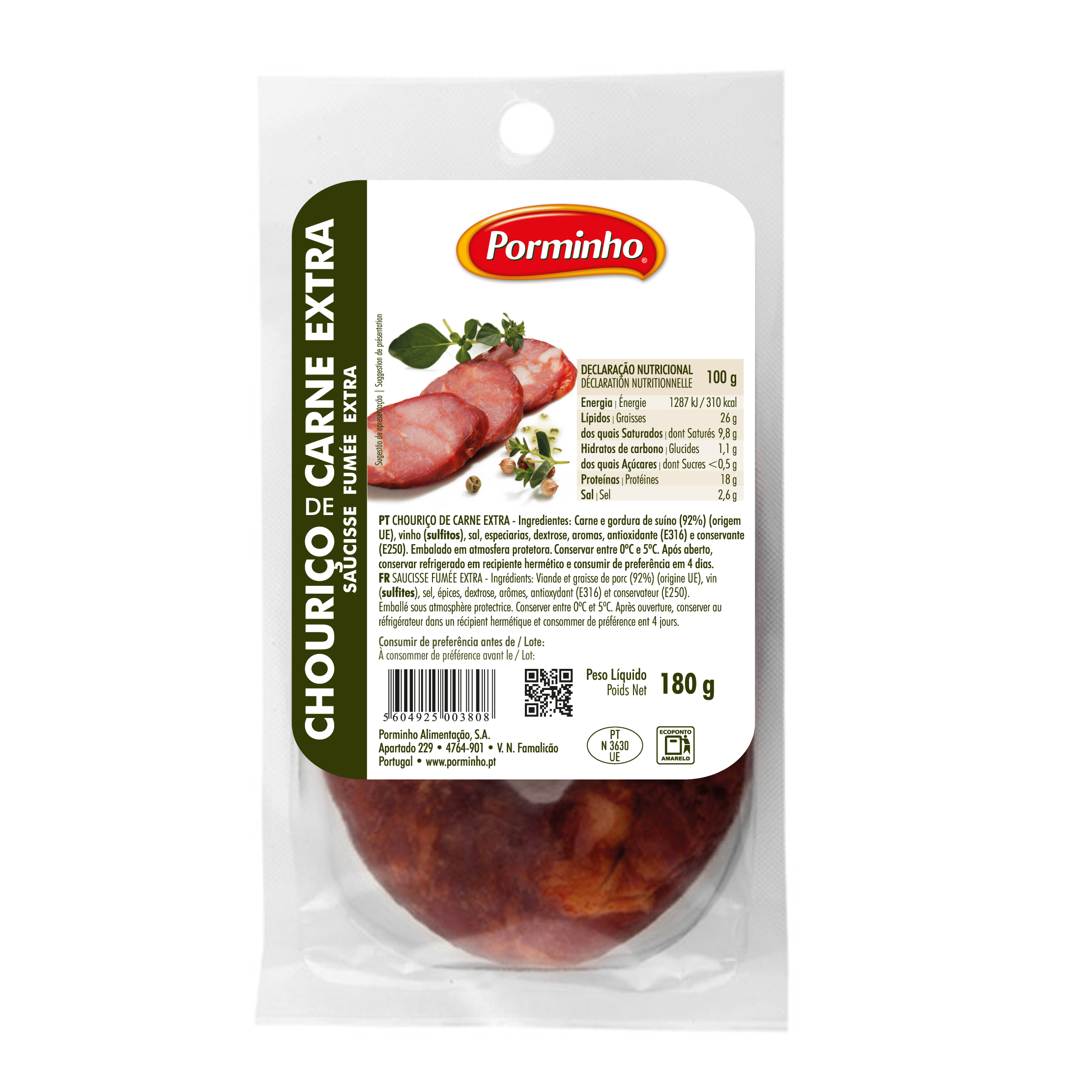 INGREDIENTES: Carne e gordura de suíno (92%) (origem: UE), vinho (sulfitos), sal, especiarias, dextrose, aromas, antioxidante (E316) e conservante (E250).