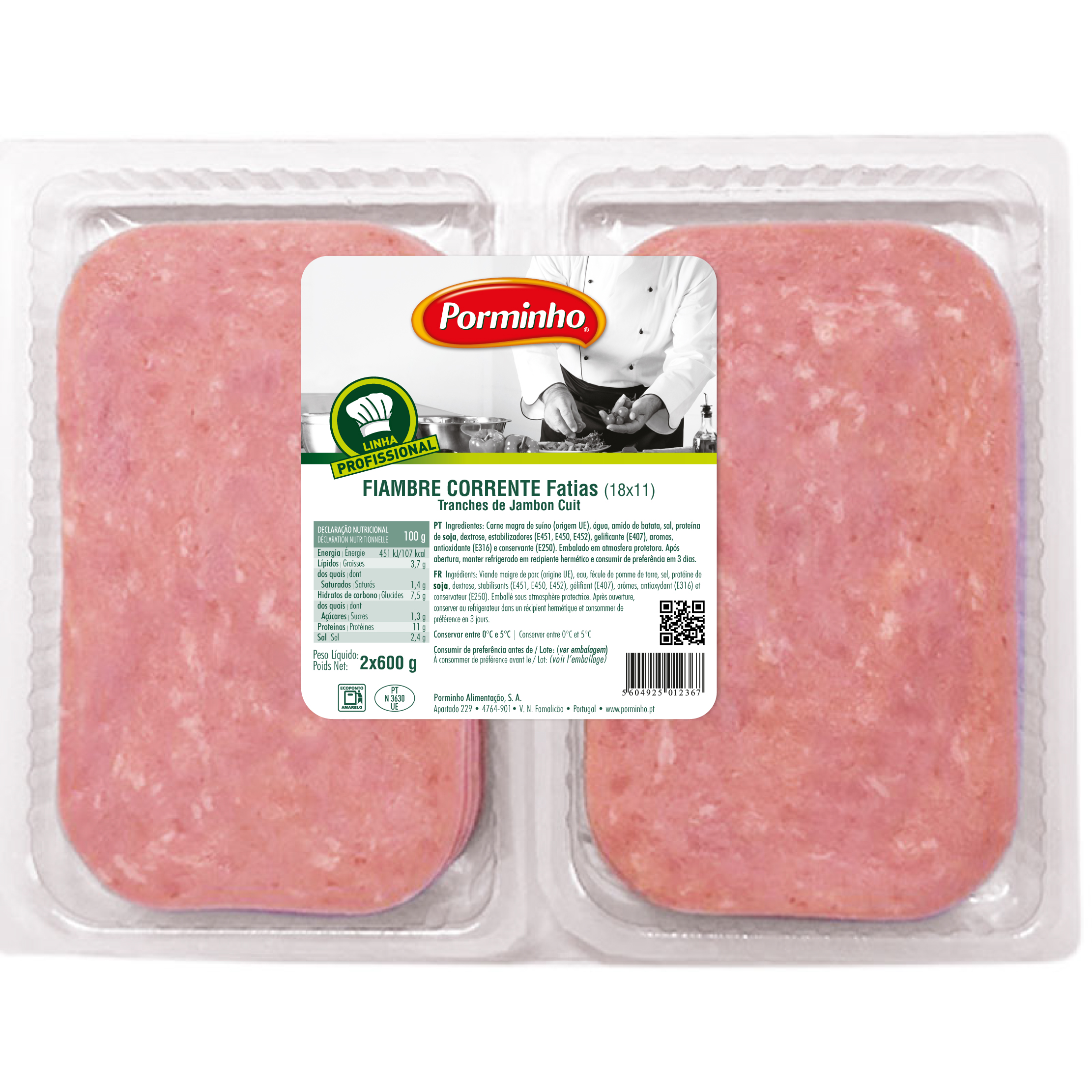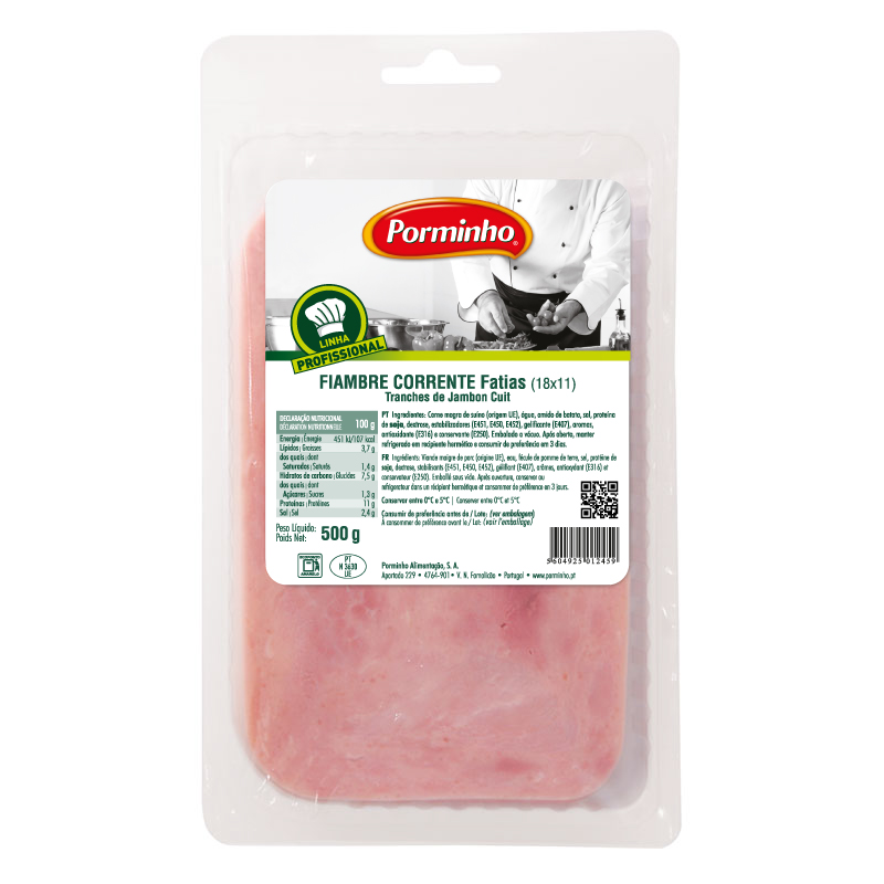 INGREDIENTES: Carne magra de suíno (origem UE), água, amido de batata, sal, proteína de soja, dextrose, estabilizadores (E451, E450, E452), gelificante (E407), aromas, antioxidante (E316) e conservante (E250).