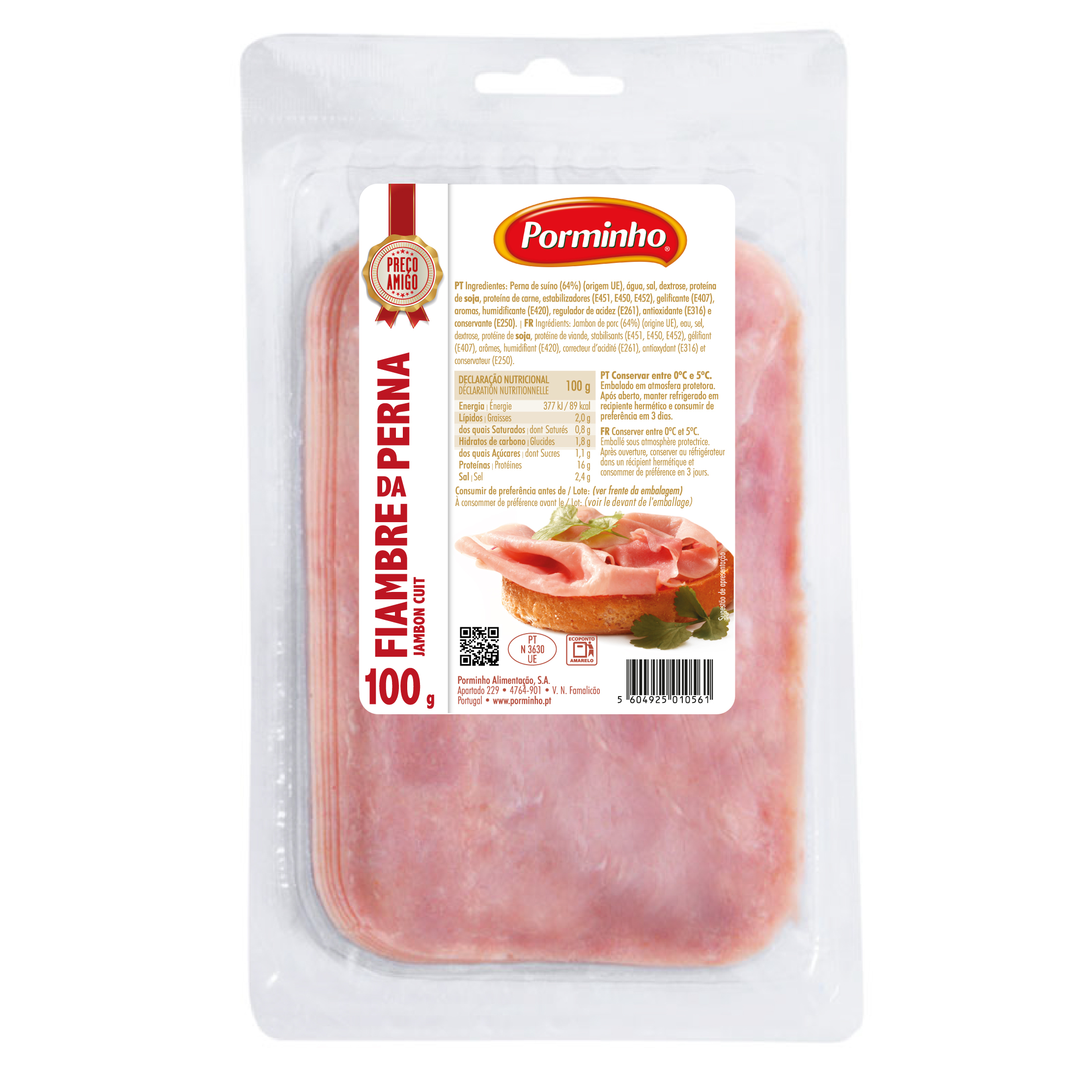 INGREDIENTES: Perna de Suíno (64%) (origem: UE), água, sal, dextrose, proteína de soja, proteína de carne, estabilizadores (E451, E450, E452), gelificante (E407), aromas, humidificante (E420), regulador de acidez (E261), antioxidante (E316) e conservante (E250).