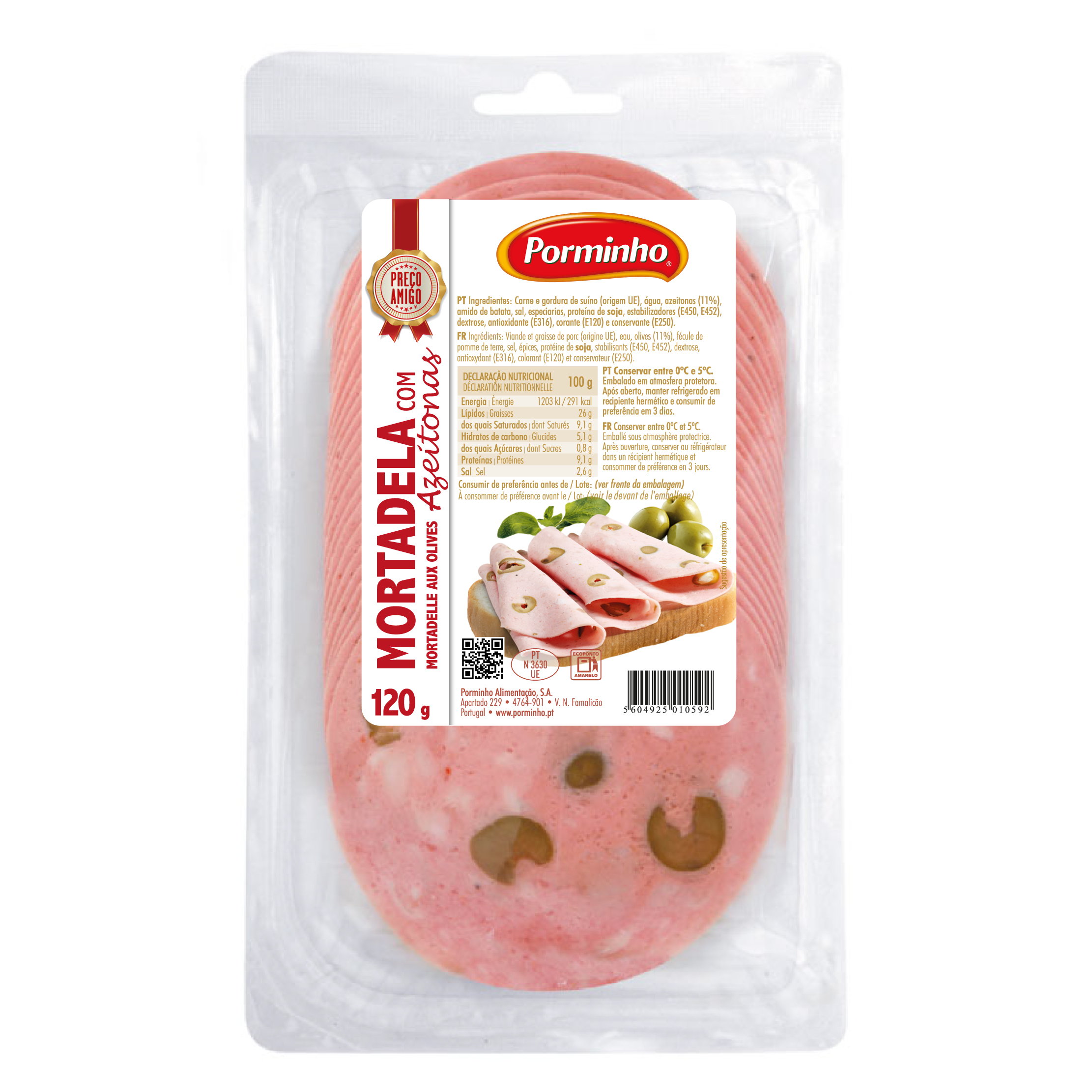 INGREDIENTES: Carne e gordura de suíno (origem UE), água, azeitonas (11%), amido de batata, sal, especiarias (mostarda), proteína de soja, estabilizadores (E450, E452), dextrose, antioxidante (E316), conservante (E250) e corante (E120).